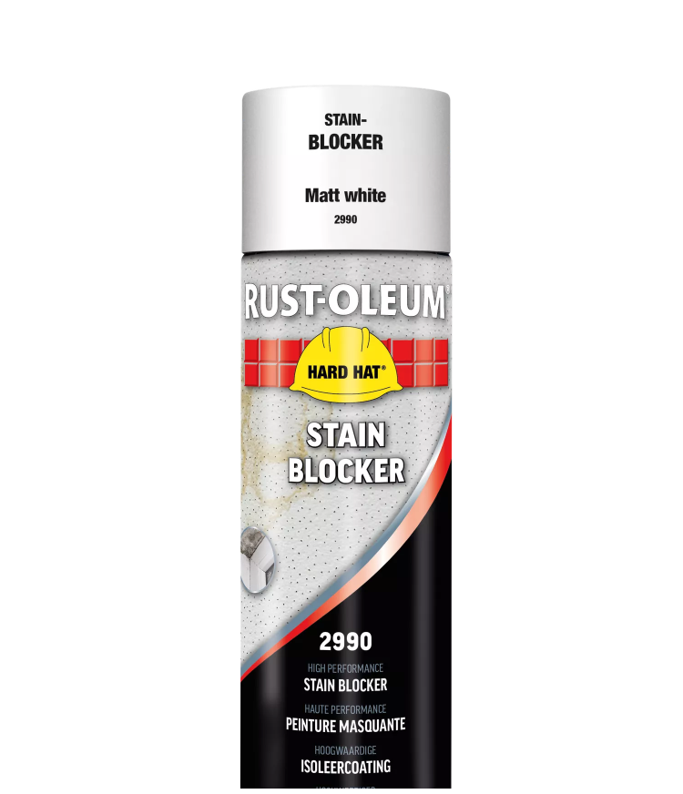 Rust-Oleum Hard Hat Stain Blocker är en högpigmenterad sprayfärg utvecklad för att effektivt blockera och isolera svåra fläckar på väggar och tak. Produkten ger en matt vit yta med mycket hög täckförmåga och förhindrar genomslag av exempelvis nikotin, sot, fukt och rost. Snabbtorkande formulering gör den lämplig för professionellt underhålls- och renoveringsarbete.